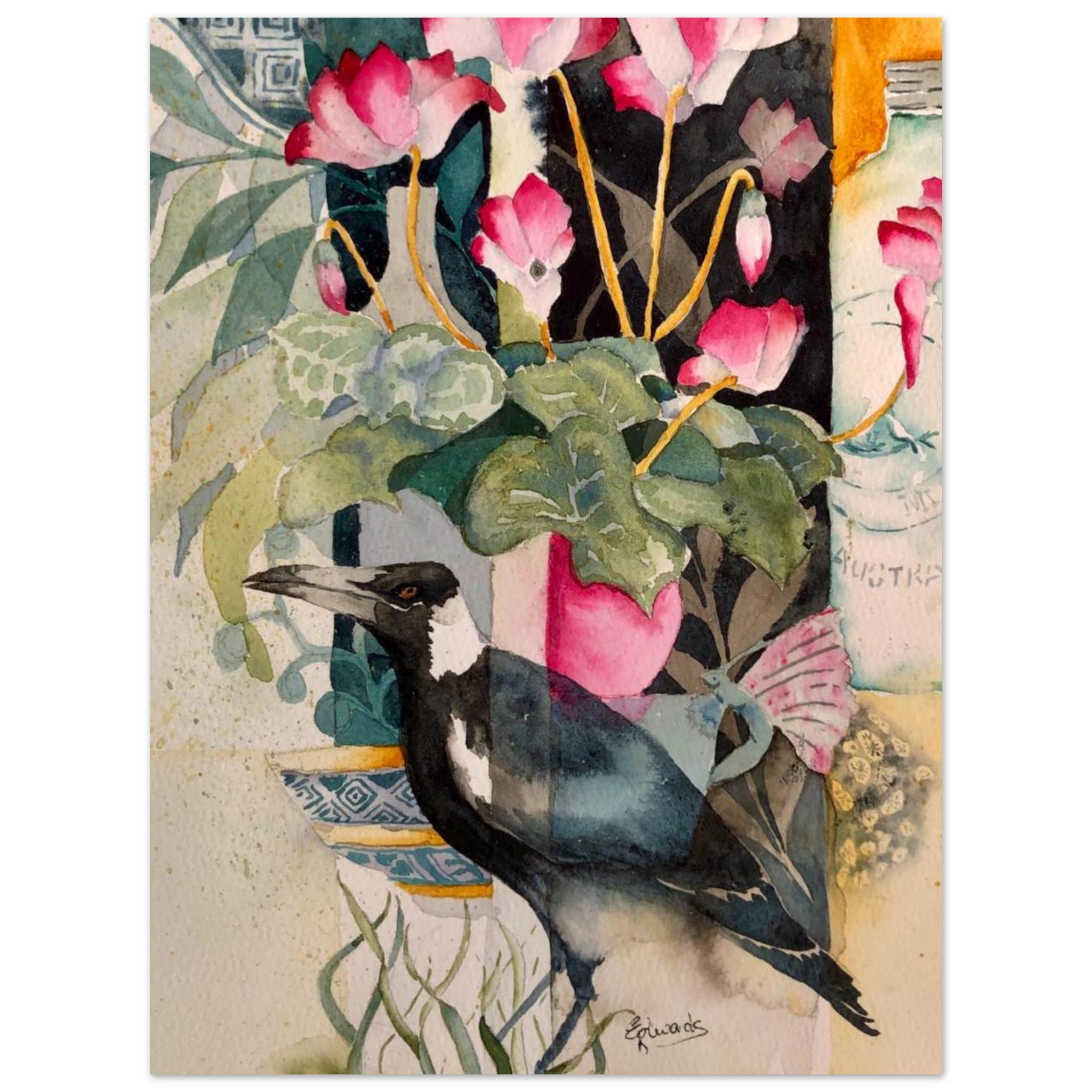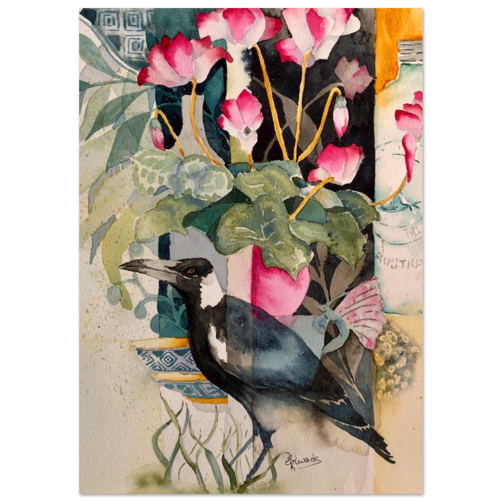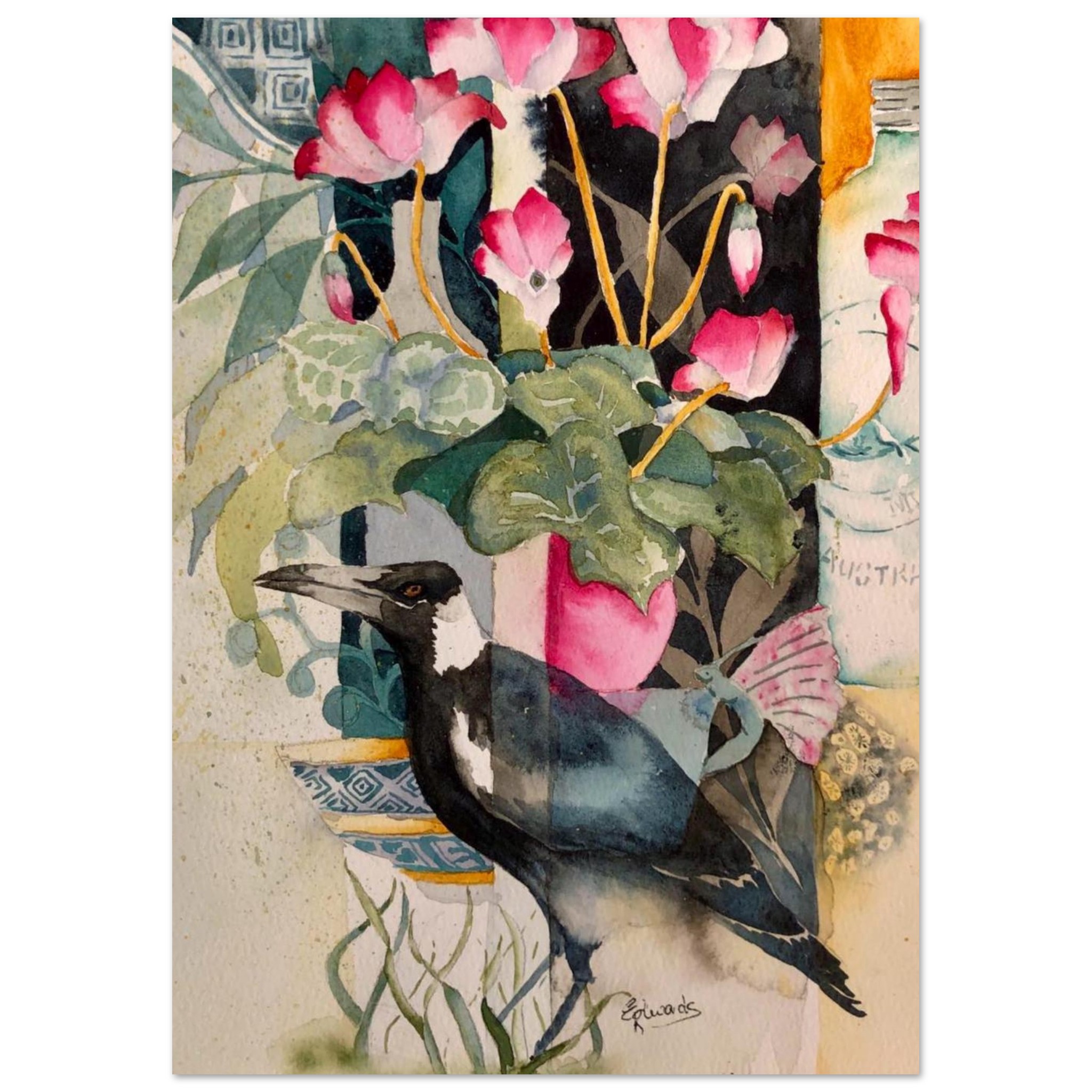 Hand painted watercolour modern still life. Featuring the iconic magpie and a glass Nestle milk jar, with a bright pink cyclamen flower pot.