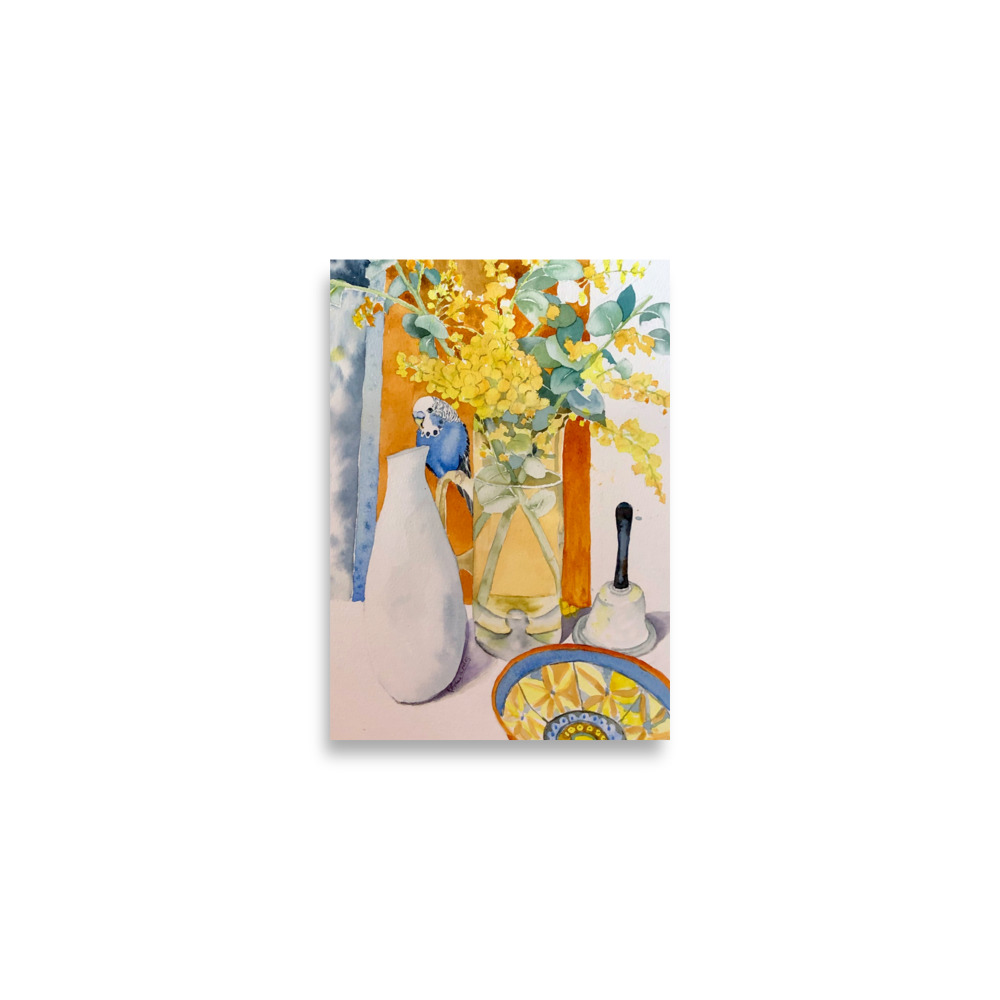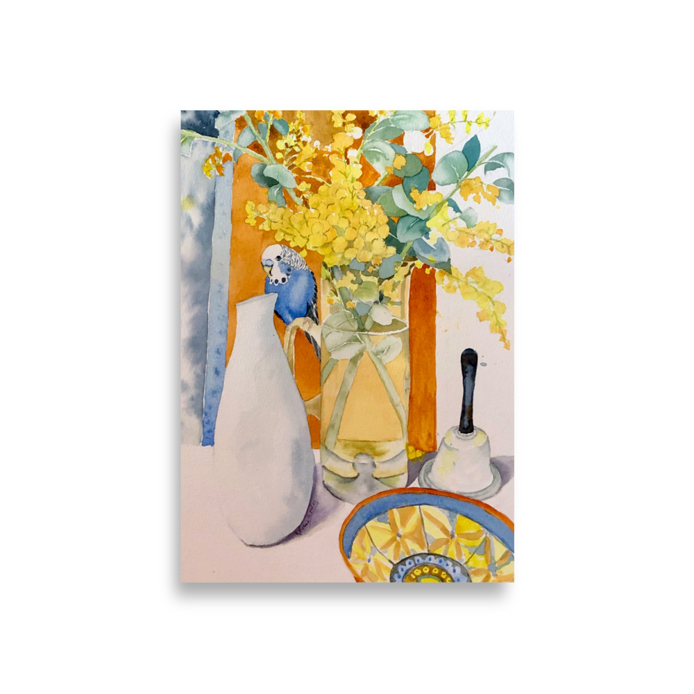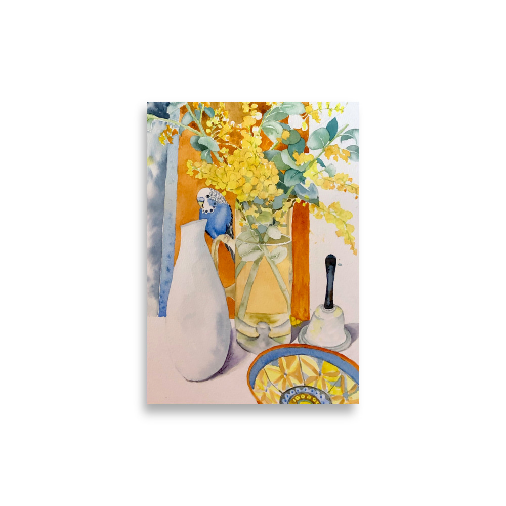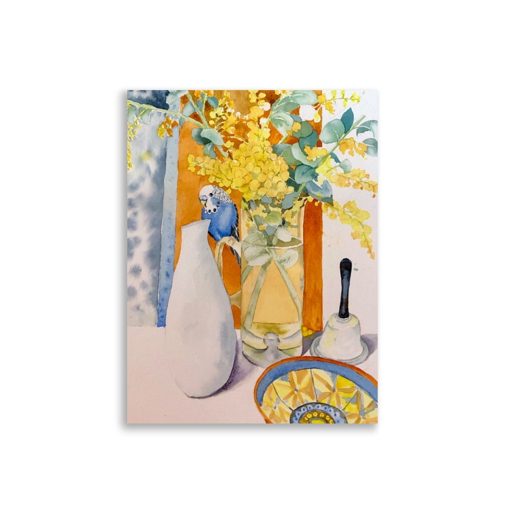 Spring wattle and a blue budgie in a still life with treasure from a lifetime. A bowl from Italy, a bell from a family corner store. Brighten your home with a little pretty boy budgie.
