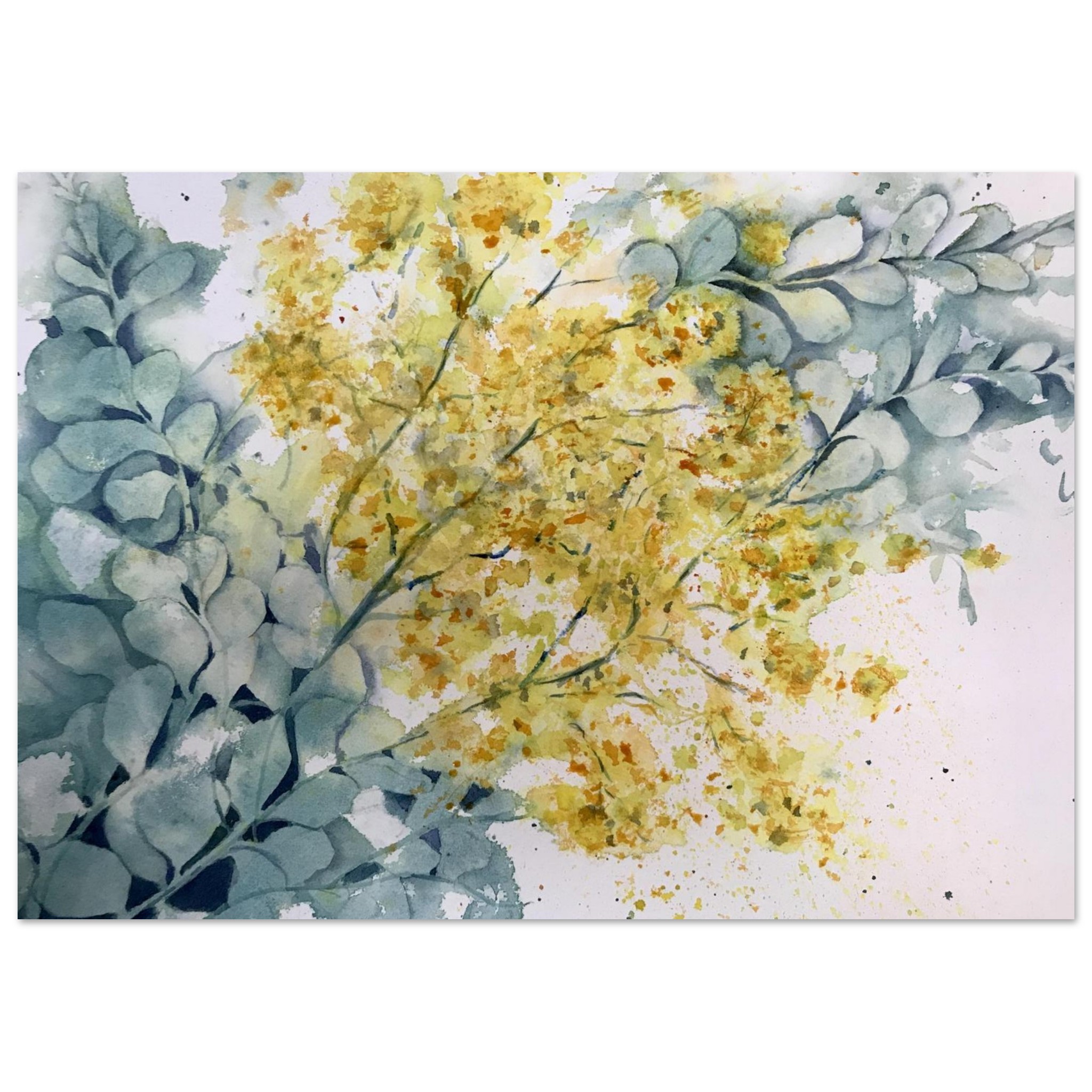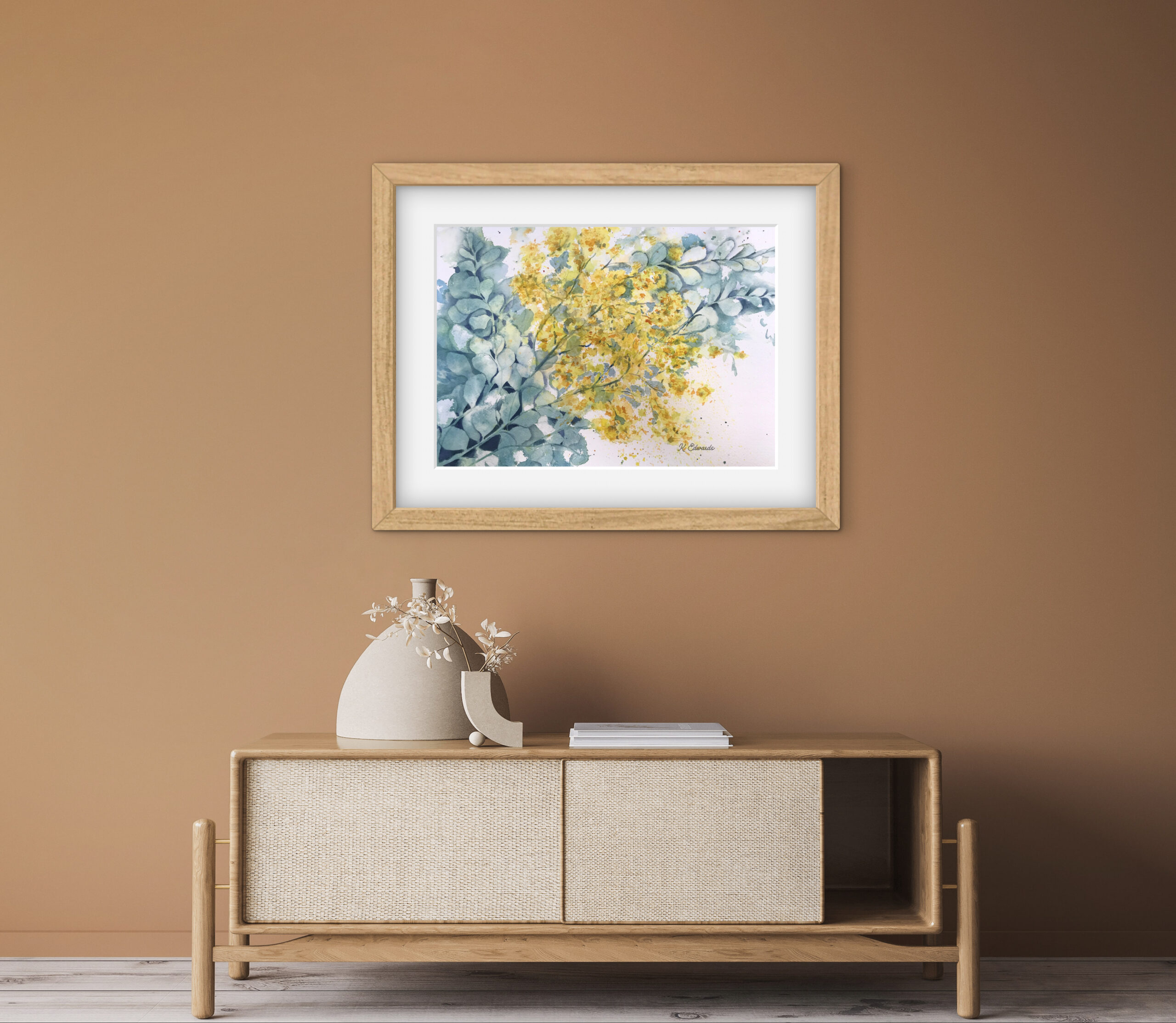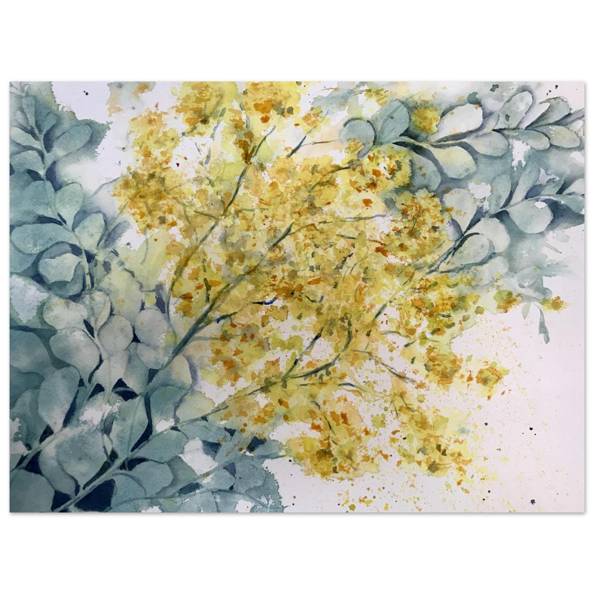 A vibrant Round Leaf Wattle watercolour print with layered leaves and blossoms created from real wattle flowers. Perfect for brightening any space.