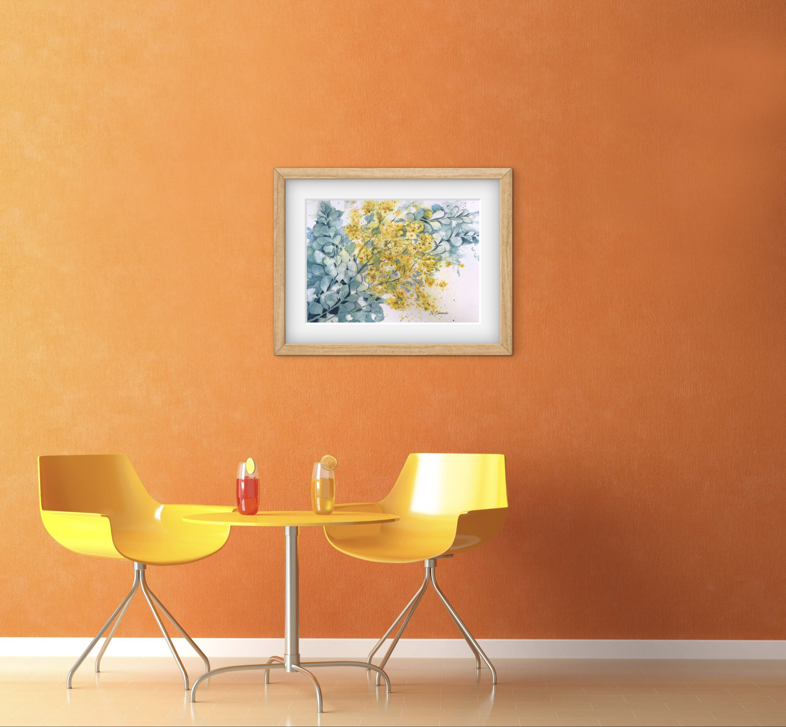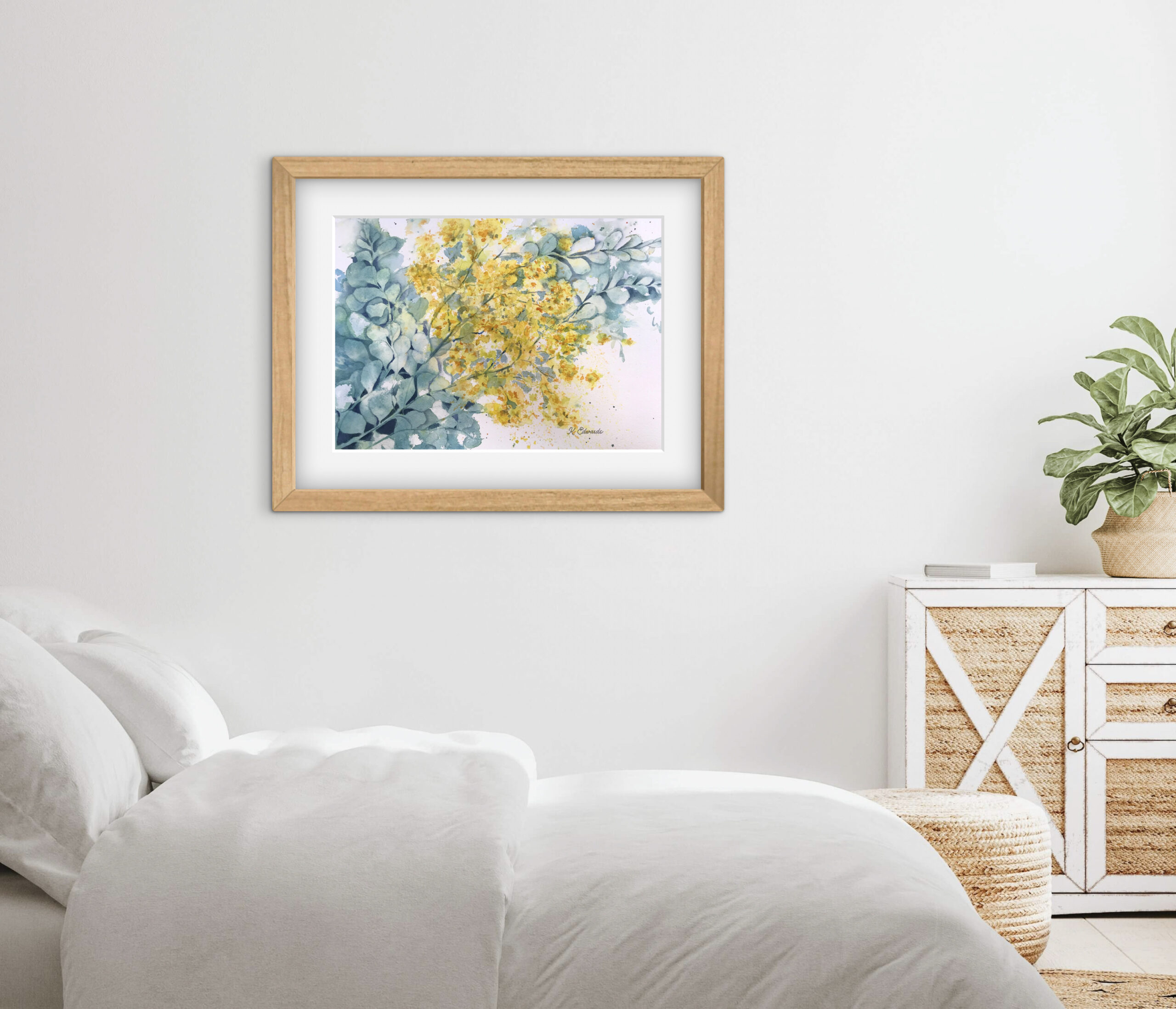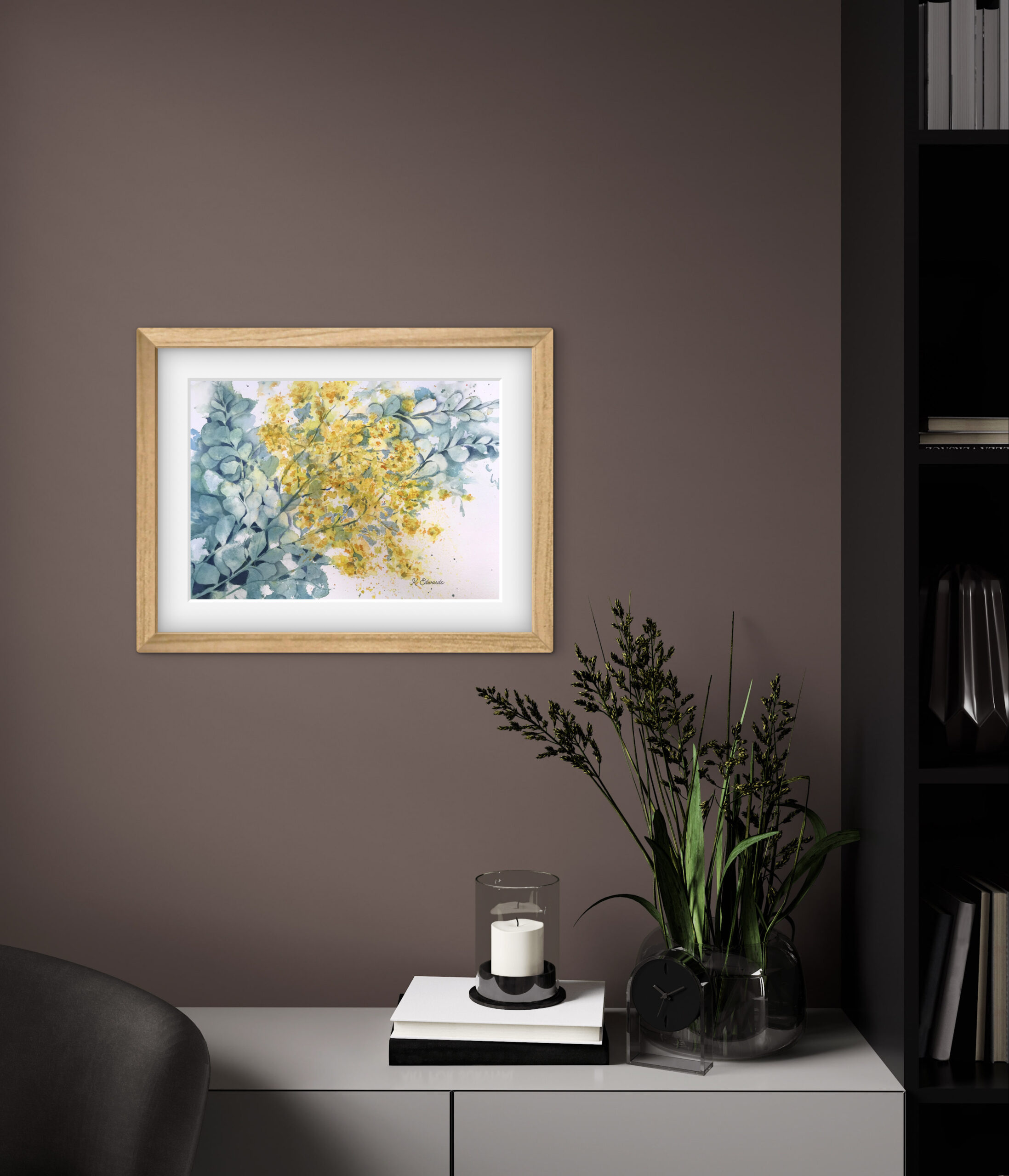 A vibrant Round Leaf Wattle watercolour print with layered leaves and blossoms created from real wattle flowers. Perfect for brightening any space.